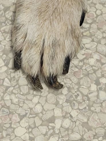 Peabody is at least 12 years old and has been very neglected. This nails are curled under and over due to not being clipped. He was put on antibiotics to help reduce the infection surrounding his bad teeth. We are waiting on his bloodwork to find out about the health of his internal organs.